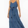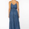 A soft and lightweight, blue tiered dress made from Tencel?. This dress features a v-neckline, a self-belt at the waist with a flowy tiered skirt.