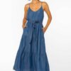 A soft and lightweight, blue tiered dress made from Tencel?. This dress features a v-neckline, a self-belt at the waist with a flowy tiered skirt.