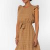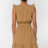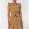The Dress is designed with timeless style and modern details. It features a sleeveless pop-over fit with a self-belted waist and is finished with intricate ruffle accents at the shoulder and hem. Enjoy a sophisticated and timeless look with this classic dress.