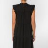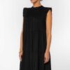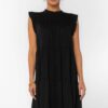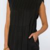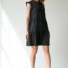 The Shelly Sleeveless Dress features ruffle sleeves, front pintuck details, a frayed hem, and a back button closure. Its pop-over style with delicate details elevates an effortless look.