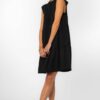 The Shelly Sleeveless Dress features ruffle sleeves, front pintuck details, a frayed hem, and a back button closure. Its pop-over style with delicate details elevates an effortless look.