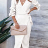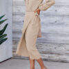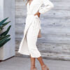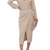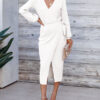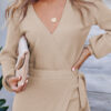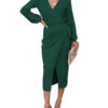 Solid color dress featrues, wrap v neck, long sleeve, higt waisted with belt, slim fit