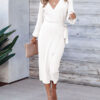 Solid color dress featrues, wrap v neck, long sleeve, higt waisted with belt, slim fit