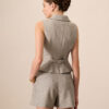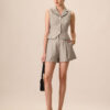 These shorts feature a sophisticated grey color and a stylish lapel detail that adds a tailored touch. The pleated front offers a flattering fit and a hint of elegance, while the functional pockets provide convenience and versatility. Perfect for casual outings or dressier occasions, these shorts can be paired with a variety of tops to create effortlessly stylish looks.