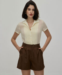 Featuring a high-waisted design that accentuates the waist, these shorts offer a flattering and comfortable fit. The pleated detailing adds a touch of sophistication, making them suitable for both casual and dressier occasions.